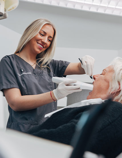 Mehr Komfort dank Intraoralscanner: Ein herkömmlicher Abdruck im Vorfeld der kieferorthopädischen Behandlung mit Alignern ist nicht notwendig – auf Abformlöffel und -masse können wir verzichten. Stattdessen scannen wir Ihre Zähne fast berührungsfrei ein.